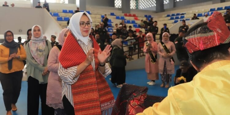 Kedatangan Airin langsung disambut meriah oleh ribuan warga yang hadir. Mereka menyambut Airin dengan menyematkan kain ulos dan tarian tradisional tortor.