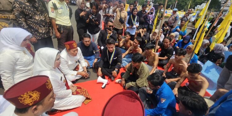 KABUPATEN SERANG, BantenHeadline.com – Bupati Serang Ratu Tatu Chasanah turun tangan menjawab aspirasi mahasiswa yang melakukan aksi demontrasi pada momen Hari Ulang Tahun (HUT) Kabupaten Serang, Selasa (8/10/2024). Tiga gelombang mahasiswa dihadapi oleh Ratu Tatu bersama Ketua DPRD Kabupaten Serang Bahrul Ulum.
