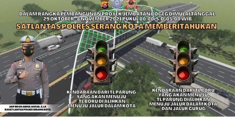 Terhitung hari Jum’at, 29 Oktober 2021, akan dilakukan pembangunan dan penambahan ruas jalan pada Jembatan Bogeg yang melintas di atas jalan tol Serang-Merak. Karenanya, arus lalulintas dari dan menuju Jembatan Bogeg ditutup sementara pada jam tertentu, hingga pengerjaan proyek jembatan selesai dan siap dilintasi kembali.