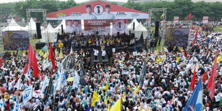 KABUPATEN SERANG, BantenHead.com – Pasangan Calon Bupati-Wakil Bupati Serang Andika Hazrumy-Nanang Supriatna menggelar kampanye akbar di lapangan Modernland Cikande, Kabupaten Serang, Minggu (17/11/2024). Tidak hanya kemeriahan suasana kampanye, selawat asyghil menggema berulangkali dilantunkan puluhan ribu massa yang hadir.