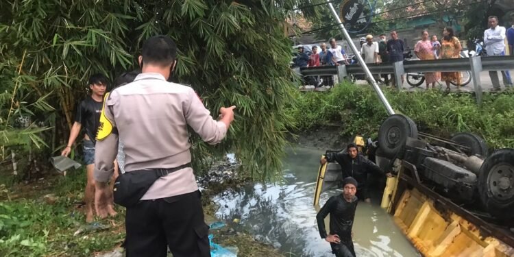 KABUPATEN SERANG, BantenHeadline.com – Diduga karena ban mengalami slip, akibat jalanan licin setelah diguyur hujan, sebuah truk jenis Mitsubishi Colt Diesel bernomor polisi A 9591 ZX yang mengangkut 1 ton ikan, nyungsep dan terguling di Sungai Sujung di Kampung Legon, Desa Sujung, Kecamatan Tirtayasa, Kabupaten Serang, Kamis (10/2/2022).